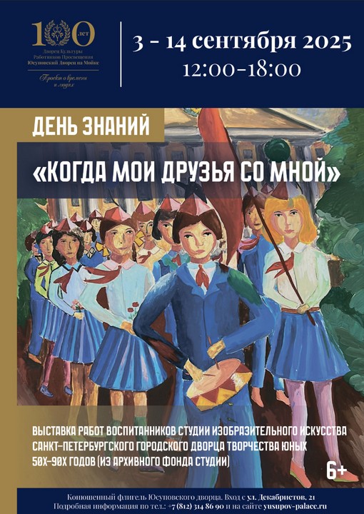 3 сентября в 16.00 в Конюшенном флигеле Юсуповского дворца состоится торжественное открытие выставки «Когда мои друзья со мной» – совместного проекта Санкт-Петербургского городского Дворца творчества юных и Дворца культуры работников просвещения «Юсуповский дворец на Мойке».