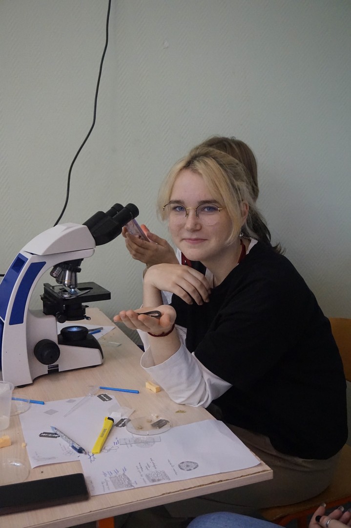 Старшие ребята со спецкурсом «Методы общей биологии» изучали животные и растительные ткани, учились делать срезы и микропрепараты.